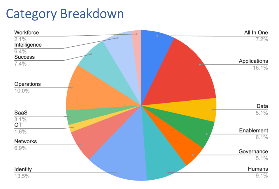 The category breakdown underscores this fragmentation. Application security alone accounted for 98 vendors, followed closely by Identity (82) and Operations (61), while newer or more niche areas like OT security remained comparatively underrepresented. This imbalance reflects both buyer demand and vendor opportunism — everyone is chasing the same crowded problems.